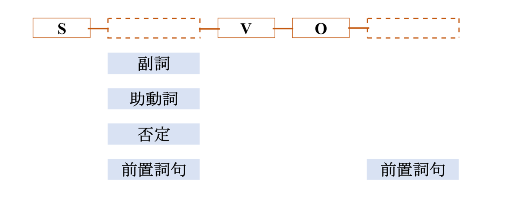 動詞の前後に置かれる要素としては、「副詞」「助動詞」「否定」「前置詞句」があります。これらの要素の位置をまとめると以下のようになります。